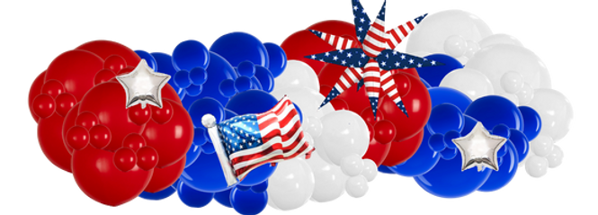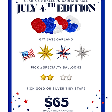 Valued normally at $130, get your HALF PRICE patriotic balloon garland for your July 4th, Labor Day or Memorial Day get together! Choose 2 specialty balloons and let us know if you want silver or gold tiny accent stars.